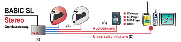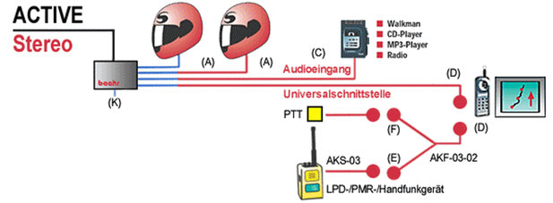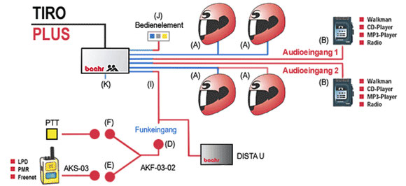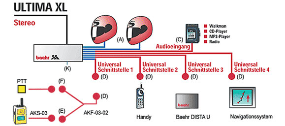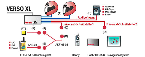 Eine Umschaltung von Außenlautsprechern auf Helmlautsprecher ist ebenso enthalten.