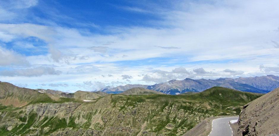 Saint-Etienne-de-Tinée überquert man zunächst den Col des Restefond (2.680 m) und anschließend den Col de la Bonette (2.715 m).